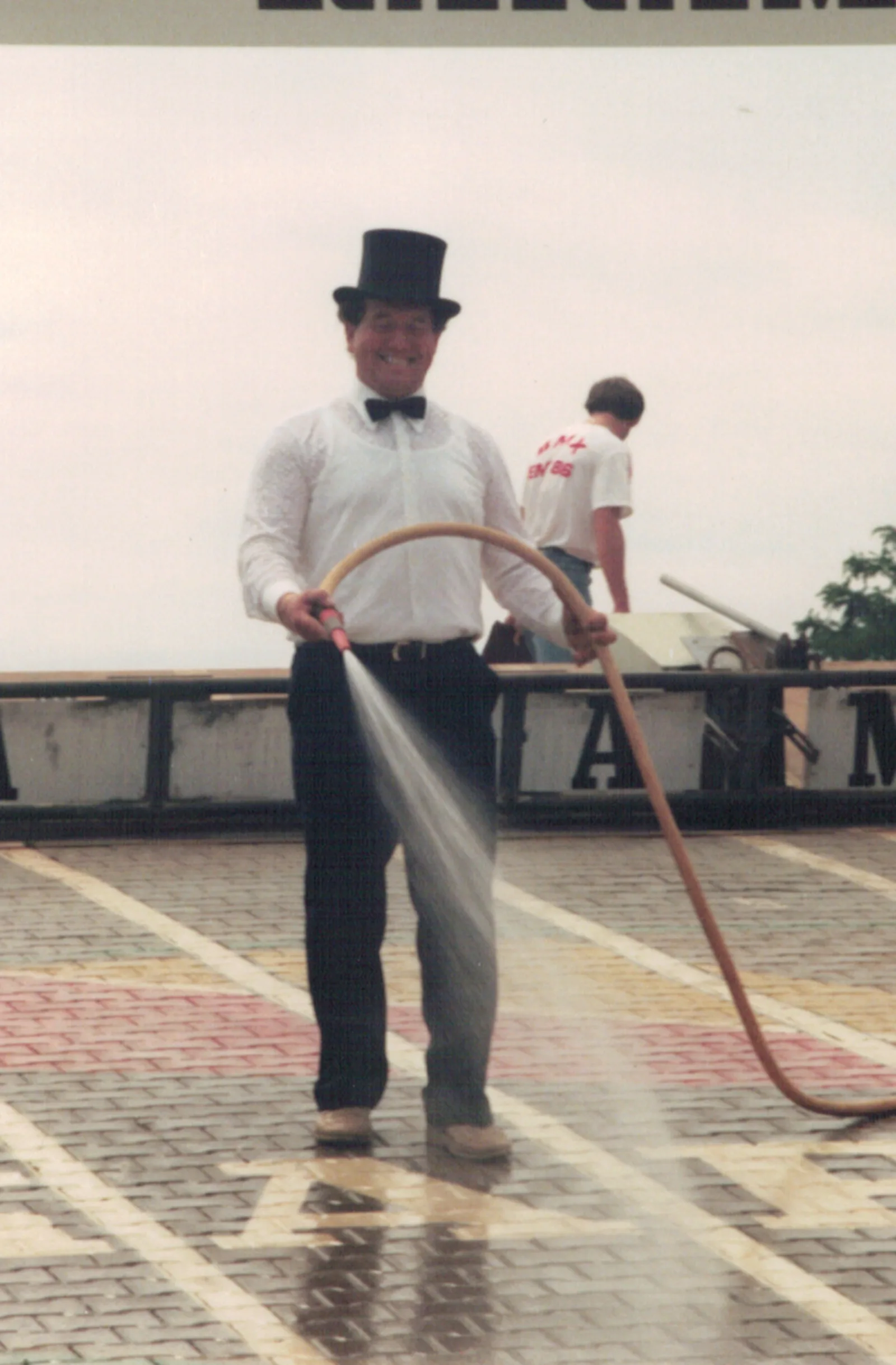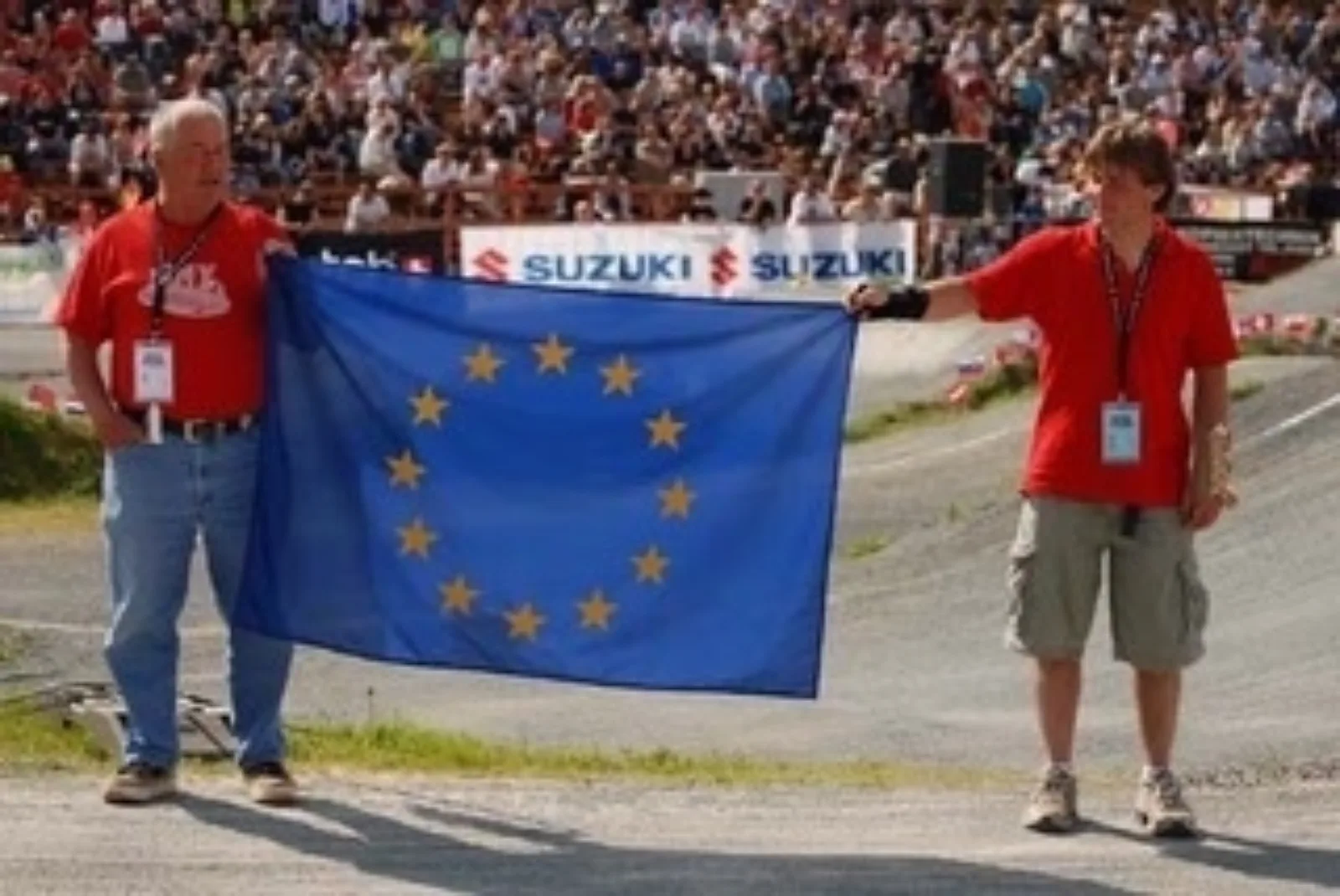 Neben mehreren Läufen zur Deutschen Meisterschaft war wohl die Europameisterschaft 1986 sein größtes Ereignis, an dem er für den Verein aktiv teilnahm. Hier kam es zu einer sehr bekannten Szene, die auf eine ungewöhnliche Wette zurückzuführen ist. Hans hatte im Vorfeld mit Frau Kienzle gewettet, dass er bei der Europameisterschaft mit Frack und Zylinder auf einem gewöhnlichen Fahrrad über die Strecke fahren würde. Der Wetteinsatz war eine Kiste Sekt. Und tatsächlich: In einer Rennpause drehte Hans in voller Montur eine Ehrenrunde auf dem Herrenrad - zur Freude der Zuschauer und zum Glück ohne Sturz. Wette gewonnen, Herzen der Gäste gewonnen, Kiste Sekt gewonnen! Ein Foto von damals zeigt Hans bei dieser Szene.