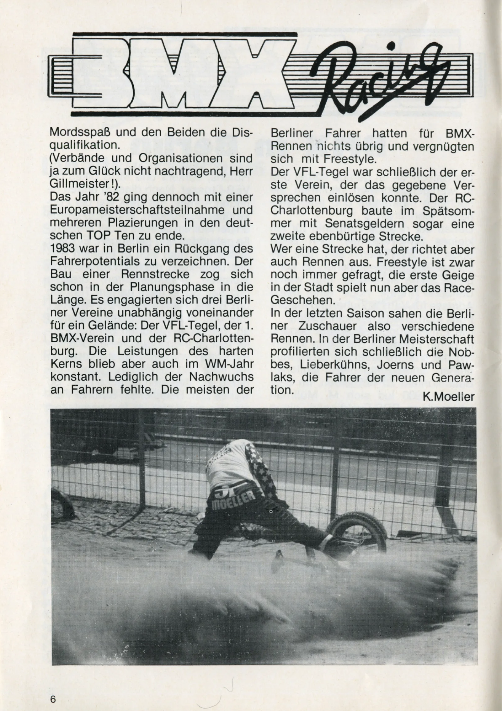 In Berliner BMXer-Kreisen galt immer die Devise "du musst nicht nur schnell sein, es muss vor allem cool aussehen". Für Karsten Moeller galt stets beides. Er und Andreas "Elle" Gillmeister waren so ziemlich die ersten BMXer West-Berlins und die ersten Gäste aus der Ferne bei Ekkehardt Teichrebers Rennen in Bremen-Grohn. Sie überredeten Michael Müllmann in seinem auf Rollerskates spezialisierten Laden "Instant Funk" BMX Räder zu verkaufen und bekamen damit einen Platz direkt an der Quelle. Und das sah man ihnen an! Niemand war so "Pro" wie die Delegation aus Berlin.