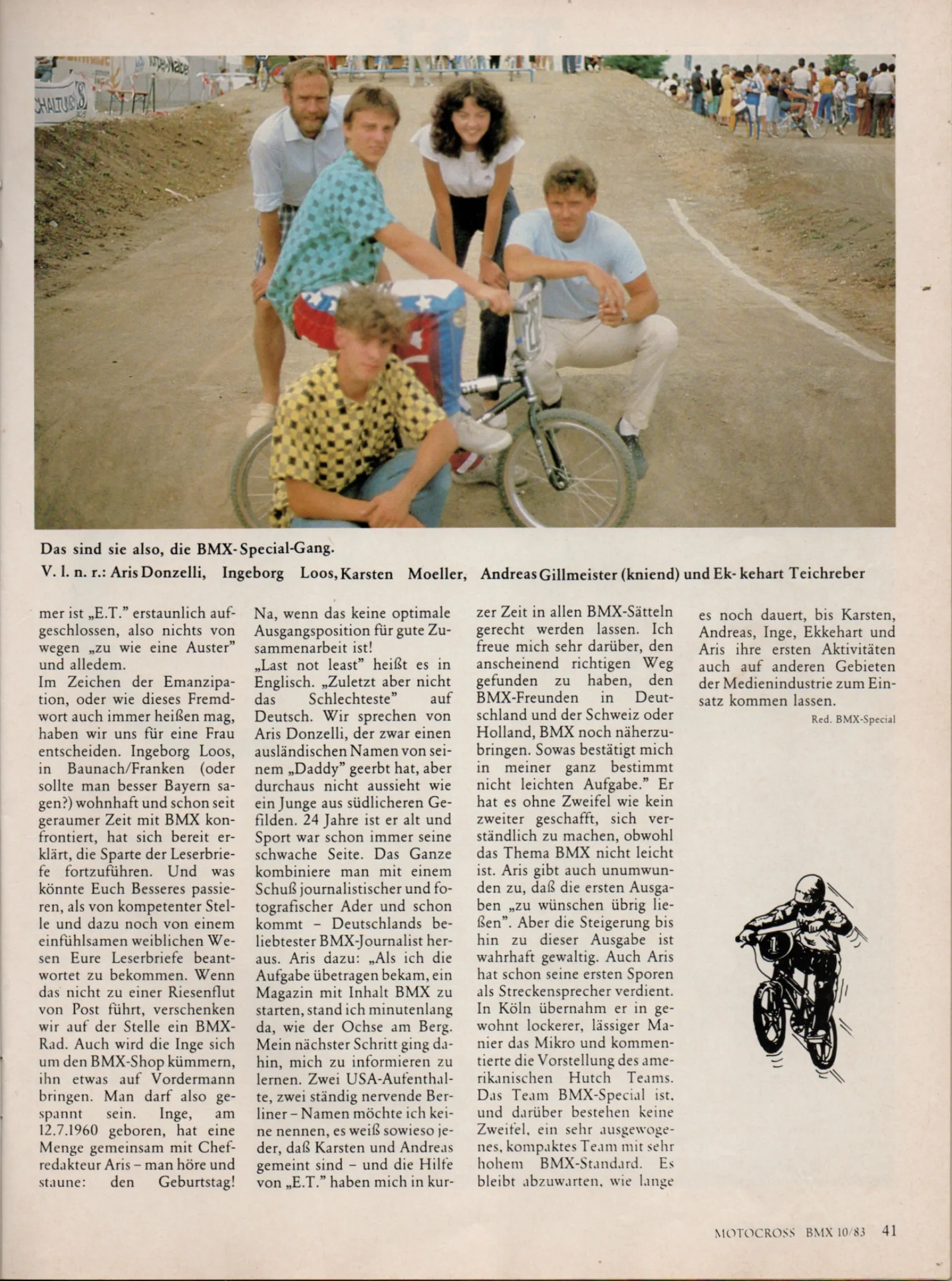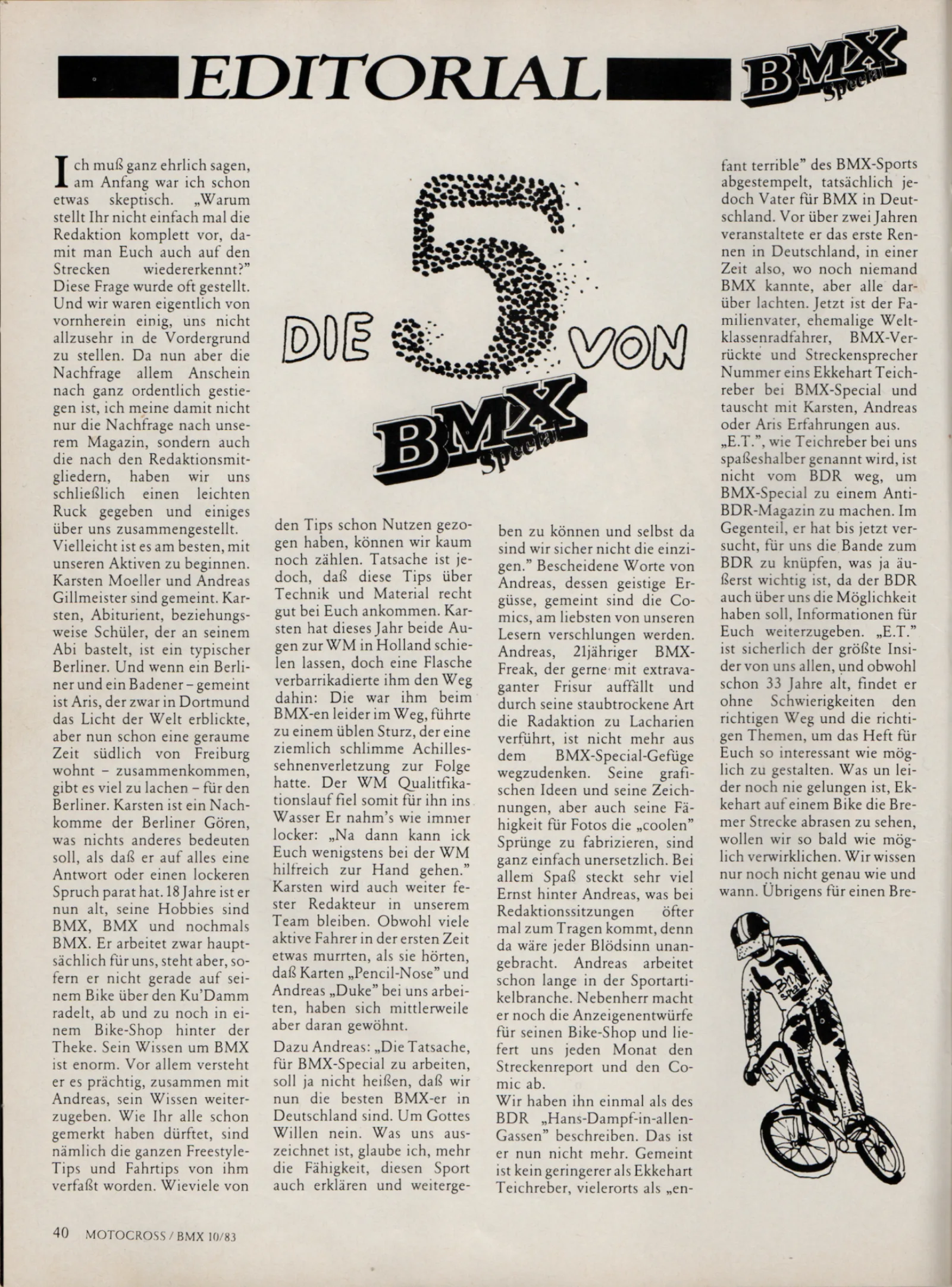 Auf die Frage, ob er nicht bei einem noch zu gründenden BMX-Magazin mitarbeiten wolle, antwortete Karsten in jugendlicher Unbekümmertheit mit "Ja klar!", ohne wirklich weiter darüber nachzudenken. Bis bei der Europameisterschaft 1982 in Beek-en-Donk ein gewisser Aris Donzelli vor ihm stand. Was folgte, war wohl die erste Redaktionssitzung des "BMX Special"-Magazines und der Beginn einer Zusammenarbeit, die ihn die nächsten drei Jahre auf Trab halten sollte.