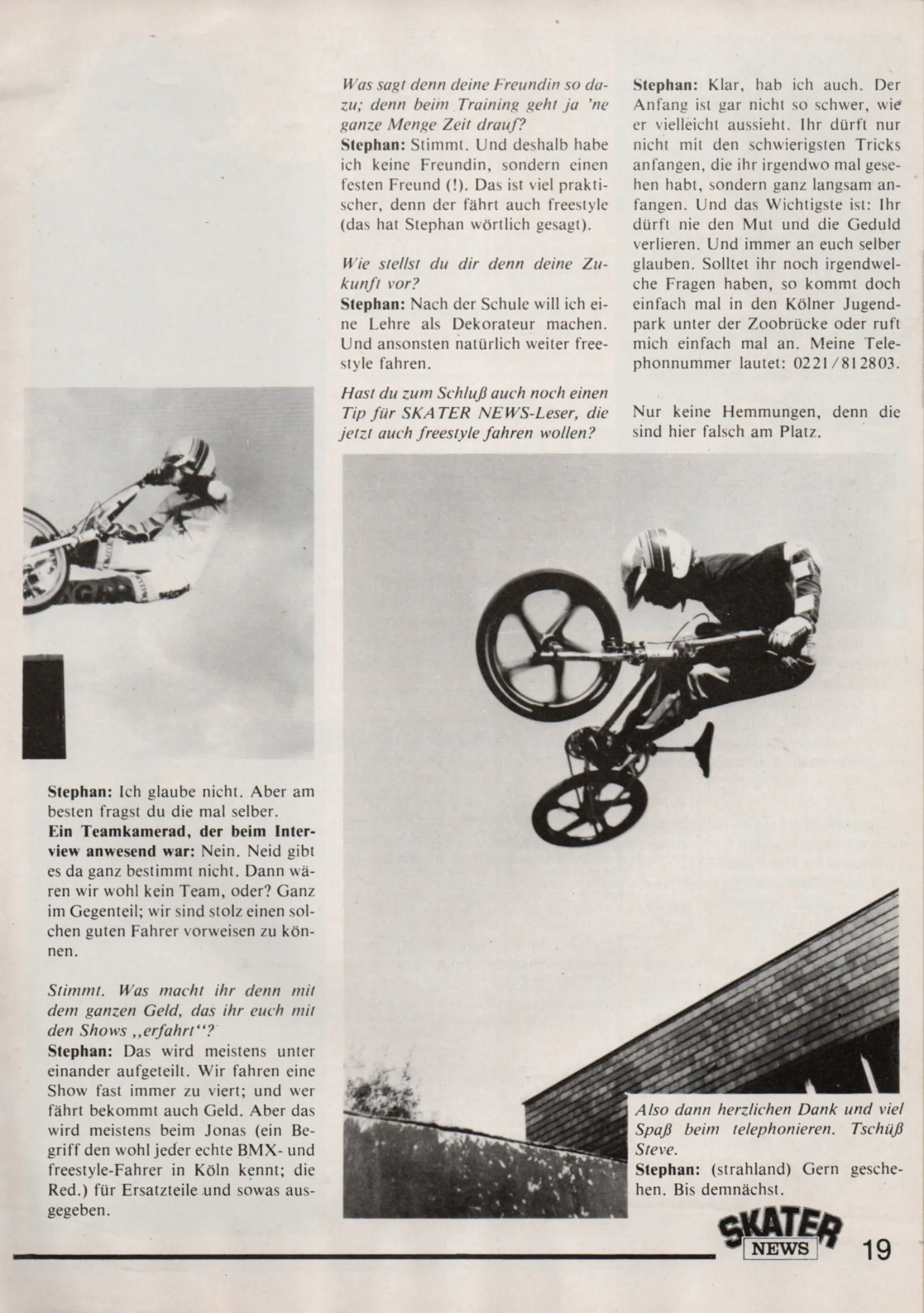 André Maletz vom Kölner Jugendpark beobachtete das Elend und nahm Stephan unter seine Fittiche. André gab dem Kölner Freestyle eine Heimat, bezog Stephan direkt in die Organisation des ersten Jugendpark Events ab 1984 ein und übergab ihm einige Jahre später das Zepter. Aus diesen Contests ist die weltweit bekannte Wettbewerbsserie unter dem Label "BMX Cologne" hervorgegangen.