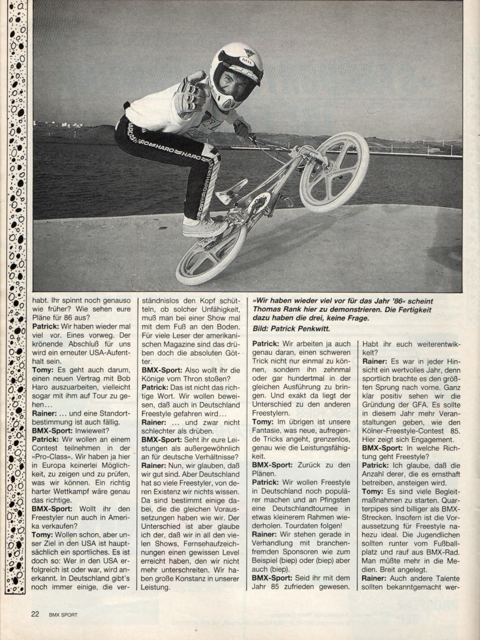 Thomas Rank begann mit dem Freestyle zusammen mit seinem Freund Patrick Penkwitt auf einem Baustahl-Rad aus der Metro. So richtig ernst wurde es aber erst, nachdem er unerwartet zu etwas Geld kam: Thomas investierte 1982 in ein schickes Redline Komplettrad und begann, sein Endo-Repertoire zu erweitern.