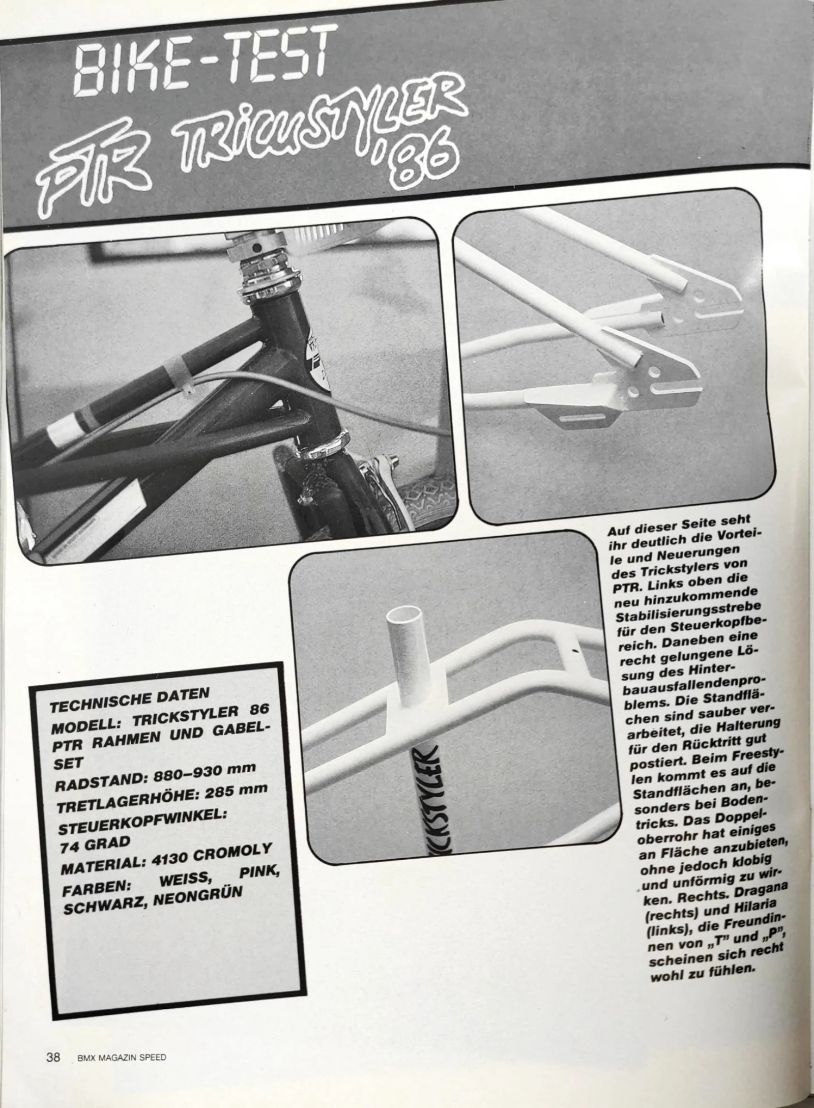 Die erste Serie des "PTR-Trickstylers" entstand und musste leider bald wieder ins Werk zurückgerufen werden: Die Idee der gekreuzten Rohre kurz vor dem Steuerrohr sah zwar elegant aus, hielt aber der Belastung einfach nicht stand. Die Konstruktion wurde überarbeitet und so entstand der bekannte PTR-Trickstyler mit der Strebe vom Steuerrohrkopf bis zur Mitte des Oberrohrs.